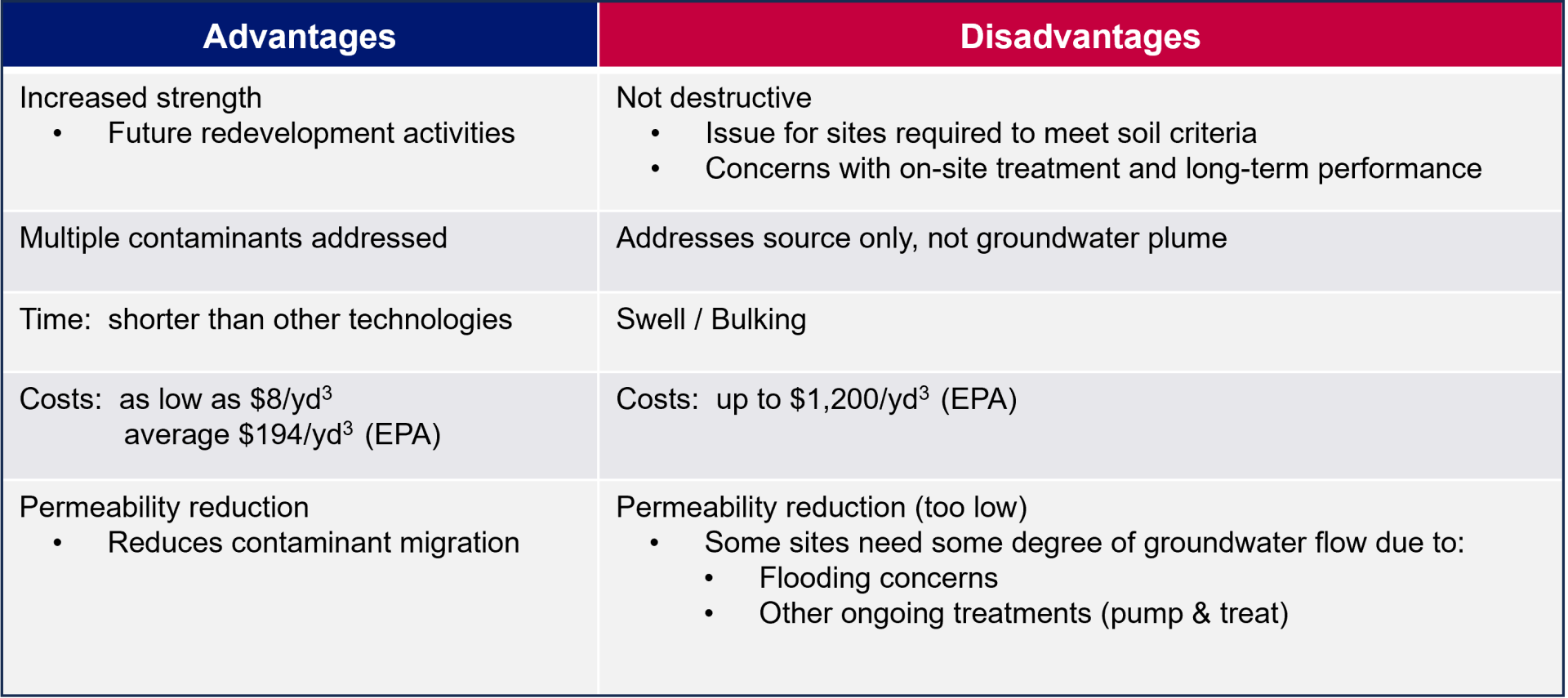 ISS can be advantageous when there is a wide range in types and concentrations of contaminants at a site. ISS typically results in increased strength of the treated media at and below the surface, which is important if the site is active or going to be used for future building structures. There is also an associated decrease in permeability and porosity, which minimizes the risk of contaminant migration offsite. Costs are variable, ranging from low to high depending on the reagents used and how they are administered.