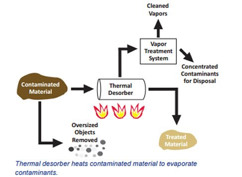 - Thermal desorption removes organic contaminants from soil, sludge or sediment by heating them in a thermal desorber. The desorber may be assembled onsite for treatment, or the material may be transported to an offsite thermal desorption facility. Low-temperature thermal desorption (200-600ºF) is used to to treat VOCs. If SVOCs are present, temperature requirements range from 600-1000ºF. Gas collection equipment captures the contaminated vapors, which often require further treatment using a thermal oxidizer, which heats the vapors to temperatures high enough to convert them to carbon dioxide and water vapor. At sites with high concentrations of organic vapors, the vapors may be cooled and condensed to change them back to a liquid form. The liquid chemicals may be recycled for reuse or treated by incineration. If the concentrations of contaminants are low enough, the vapors may be released without treatment to the atmosphere.